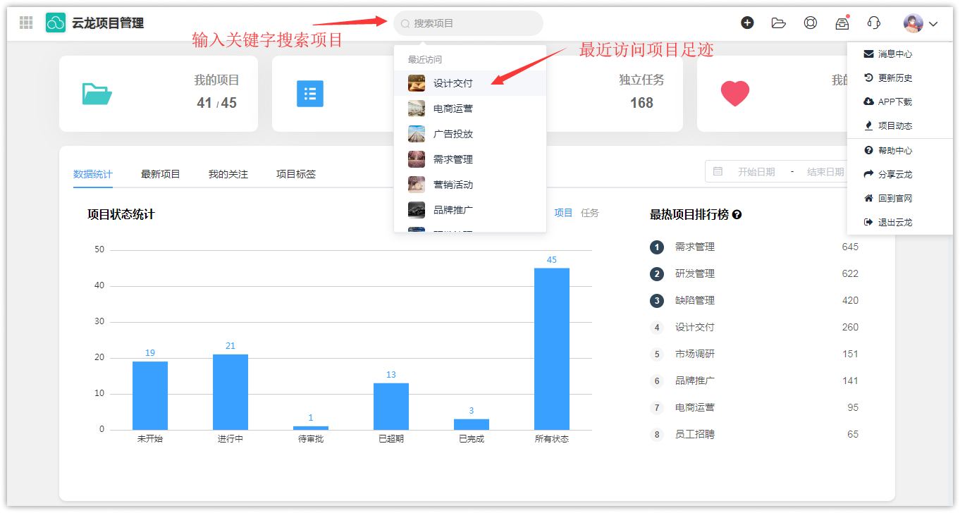顶部工具栏放置了项目足迹,可快速展开切换到最近访问的项目,也可以关键字快速搜索: