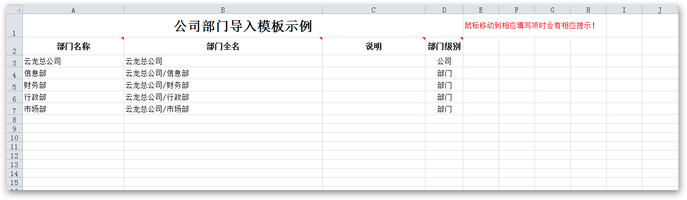 当部门较多时,用Excel导入的方式建立组织架构,将会更加高效。鼠标置于【导入部门】按钮上,将会提示注意事项: