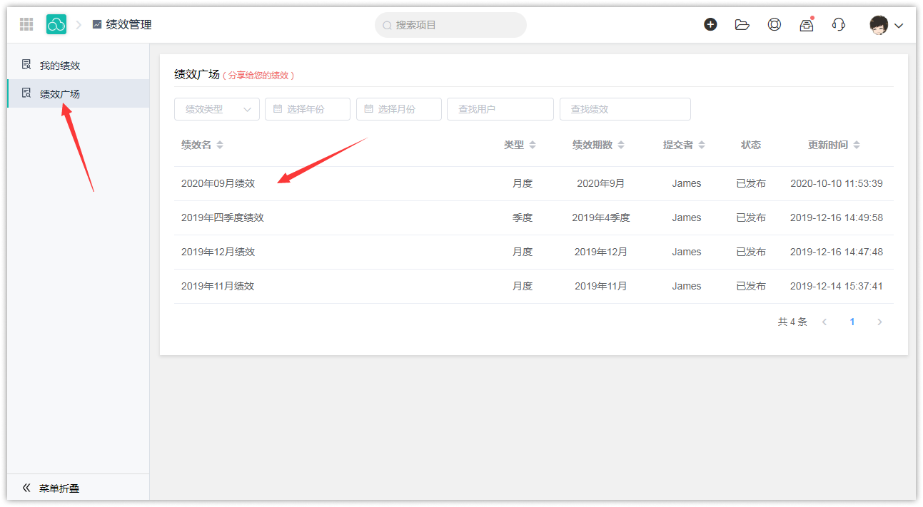 绩效发布后,被分享人将可以在绩效广场中,查看分享给自己的绩效: