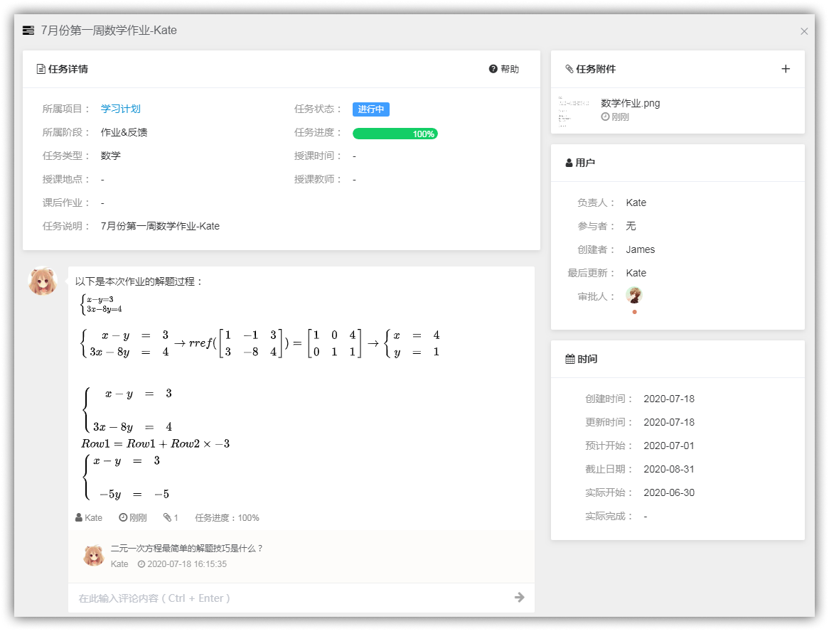 每位学员安排学习任务、提交课程作业,通过留言学习效果反馈。